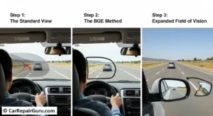 We’re going to use a technique known as the BGE (Blind spot & Glare Elimination) setting. This method is widely recommended by safety organizations like AAA because it focuses on extending your field of view outward, creating overlapping zones of visibility that cover your blind spots.